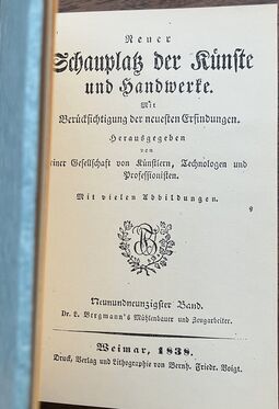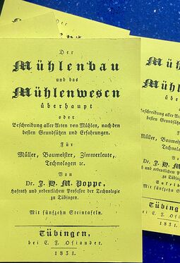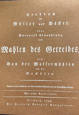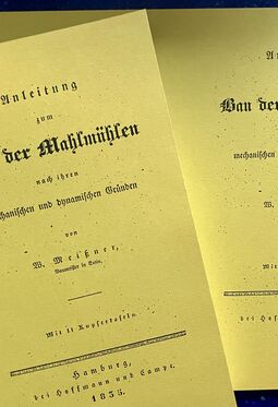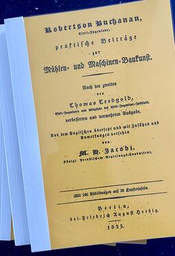 Robertson Buchanan: Praktische Beiträger zur Mühlen- und Maschinen-Baukunst. Nach der zweiten von Thomas Tredgold verbesserten und vermehrten Ausgabe, übersetzt von M.W. Jacobi, Berlin 1825, 392 Seiten, 26 Tafeln, Thermobindung in 4 Bänden (DIN A 5)