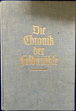 Feldmühle (Hrsg.): Die Chronik der Feldmühle, Stettin 1935, 402 Seiten, gebunden, zahlr. Abbildungen (Alterspuren), opulenter Band zur Geschichte der Mühle und der Papierherstellung.