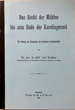 Koehne, Carl: Das Recht der Mühlen bis zum Ende der Karolingerzeit, fotokopialer Reprint, Breslau 1904, 54 Seiten, gebundenes Exemplar mit Bibliothekseinband